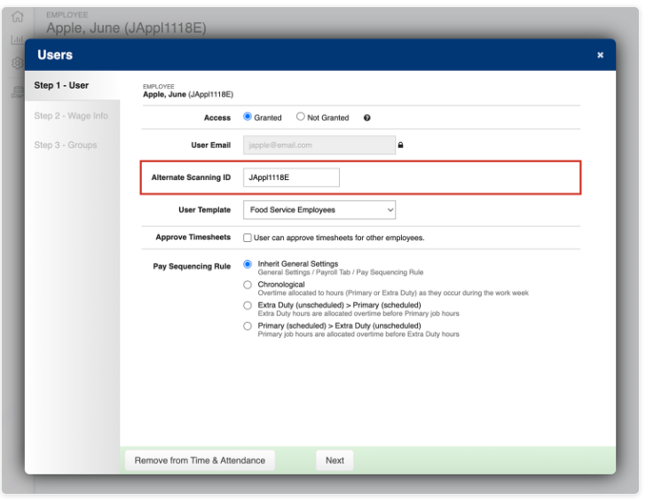 The user's Details page will open. Select Modify User Settings. A pop-up window will appear. Under “Step 1 - User”, you will see a field titled “Alternate Scanning ID”. Enter the number from the existing ID into the “Alternate Scanning ID” field.