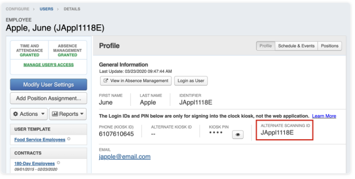 There may be a time when you would like to use an existing employee ID badge to scan in at a kiosk, but the number associated with the badge is different from the user’s time and attendance ID. This article will show you how to add an alternate ID to a user so that either ID (the time and attendance ID or the ID number on the existing card) will be associated with that user.
