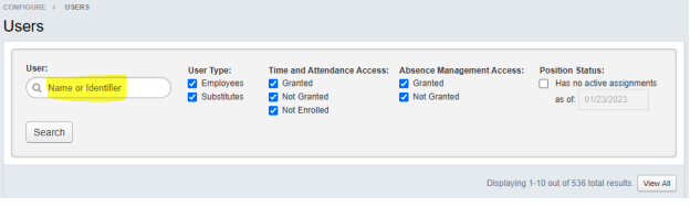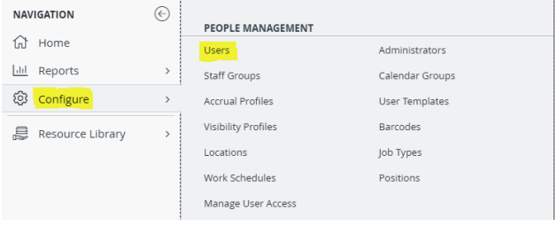 To do this, an administrator will need to sign into their Time and Attendance account, select “Configure” and then select “Users”