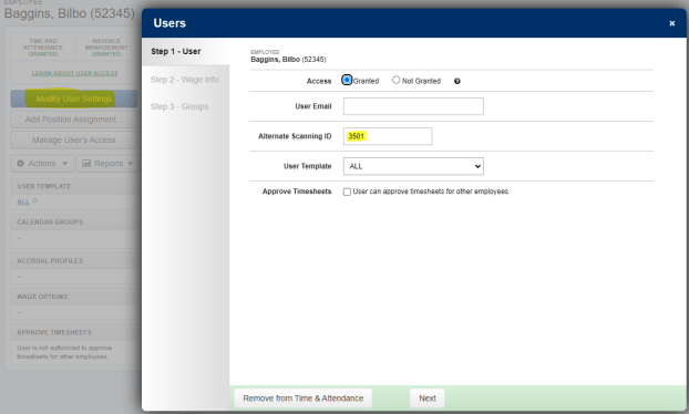 Once you are on that User’s page, select the blue button that says “Modify User Settings”. You can then enter that employee’s Badge ID into the “Alternate Scanning ID” field. After that, just navigate through the “Next” prompts at the bottom of the screen until you are able to select “Finish