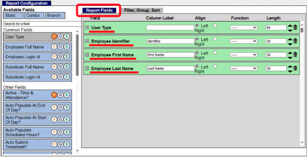 Making sure you’re on the “Report Fields” tab, Drag “User Type”, “Employee Identifier”, “Employee First Name”, & “Employee Last Name” from the left side into the gray square.