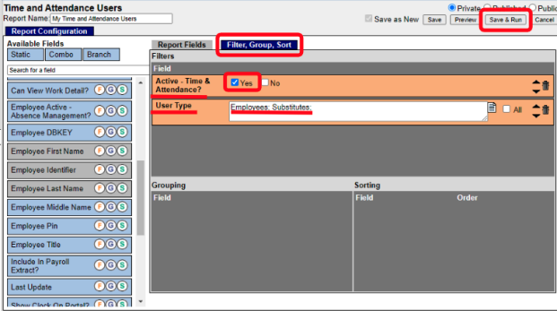 Deselect the “No” checkbox if you want active Time and Attendance employees only, or keep them both checked if you want all Employees Type, then select “Employees” in the User Type text box if you want employees only.