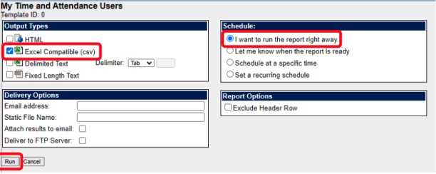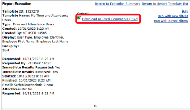 Click the “Download as Excel Compatible (CSV)” hyperlink to download, and then open the “My Time and Attendance Users” Excel Spreadsheet