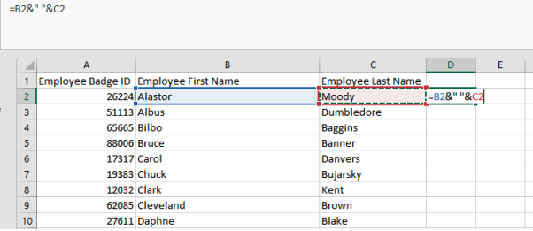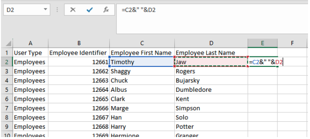 First, you will need to combine the first names and last names into one column: Select the E2 column, and type =C2&” “&D2 and hit enter