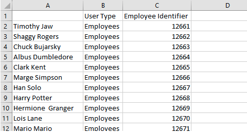 ***The “User Type” in Column A should be singular, so either “Employee” or “Substitute”. If it populates as a plural with an “s” at the end, change them all to singular. This can be done quickly by changing 1, copying it, and then pasting it to all of the other cells at once. You should be left with a spreadsheet that looks like this:
