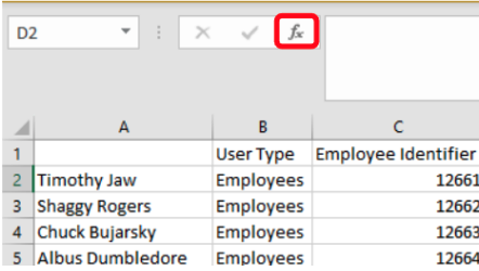 *** From here, we need to essentially combine the two spreadsheets so that we’re left with 3 columns: User Type, Employee Identifier, and Alternate Scanning ID. This can be done any way that you want, however, below are outlined steps to use the “VLOOKUP” function in Excel. If you do not feel comfortable doing that, you can manually transfer the data from one spreadsheet to the other, or you can always reach out to Touchpoint for assistance.
