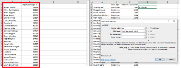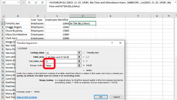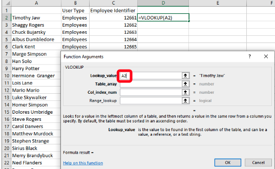 In the “Lookup_Value” text box, select column A2 on the “My Time and Attendance Users” Excel Spreadsheet