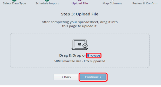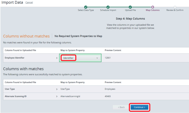 Either drag and drop the “Employee Alternate Scanning IDs” Excel file into the dotted square, or select the blue “Browse” text, navigate to the Excel file, and select it.