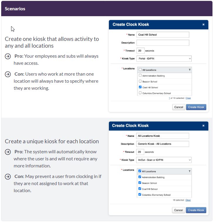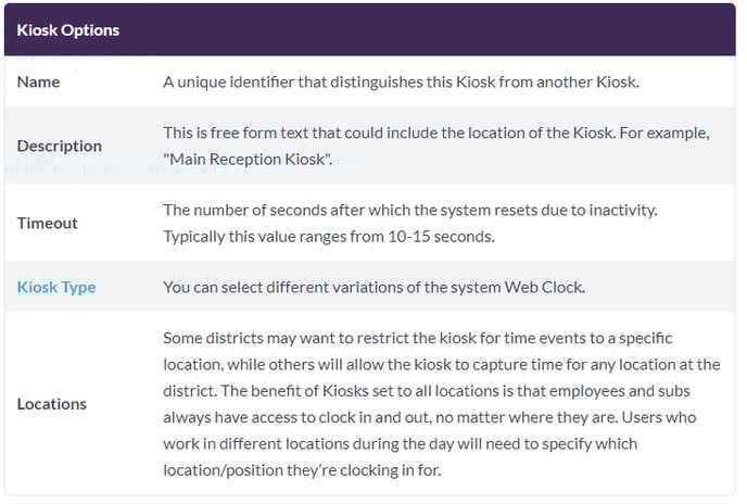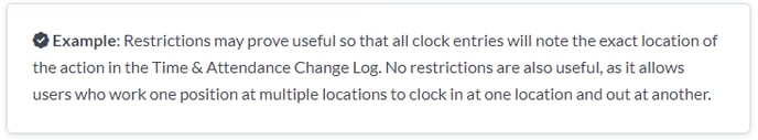 - Kiosks with restrictive settings to only allow clock events for positions at a specific locale.