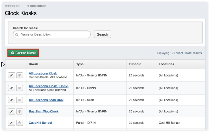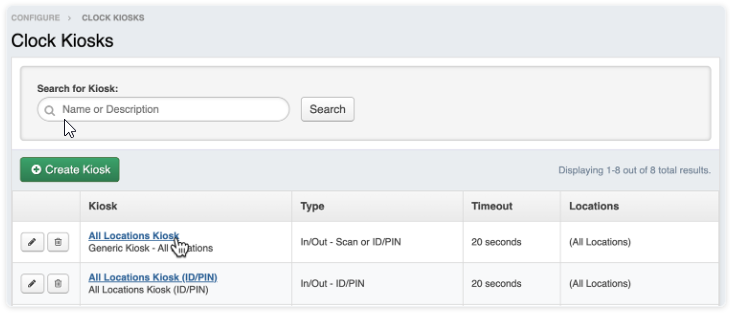 To launch a specific kiosk, return to the Clock Kiosks page and click the name (blue link) of the kiosk you would like to launch.