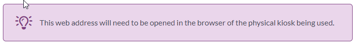 Any of these settings can be edited at a later time. But if you change the Kiosk Type, you will need to relaunch the kiosk window on its respective computers and create a new shortcut once changes have been made. It is recommended that you consult your IT department to set up a computer to act as a kiosk. They can save a shortcut on the computer's desktop that automatically opens the proper kiosk, and they will often write a script to auto-launch the shortcut if the computer is restarted.
