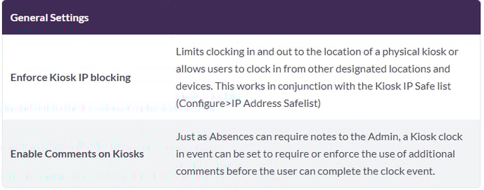 The "Time Events" tab will open by default on the General Settings page. Two specific fields are important in relation to the new kiosk setup, as outlined below:
