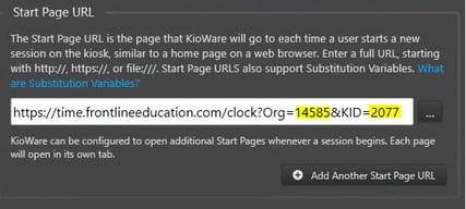 Enter the Kiosk URL for this time clock (there is a copy and paste me text file on the desktop to assist with formatting). Ensure the ORG ID and the KID are for your district and clock, so your clock can access your Frontline account.