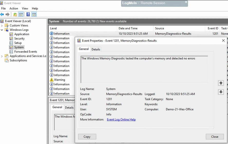 - The results can be found in Event Viewer - choose Window Logs, then System. Search for MemoryDiagnostics-Results